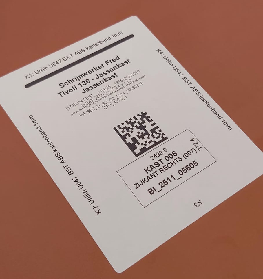 Elk kastonderdeel heeft een (makkelijk verwijderbaar) label met daarop jouw bedrijfs- en klantnaam. Geen verborgen branding. Dit is jouw project. Het label bevat daarnaast ook nog andere zaken zoals het kastnummer, naam van het onderdeel, montagerichting, materiaalcode, afmetingen, ...